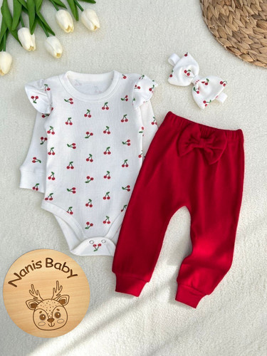 ست سه تیکه بادی شلوار هدبند بچگانه طرح آلبالو